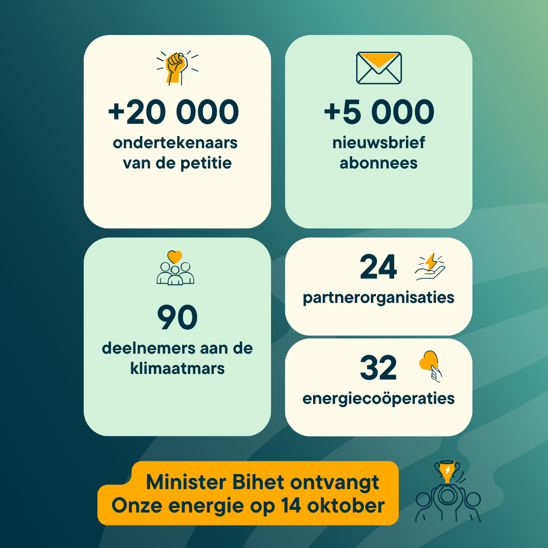Onze campagne bracht coöperaties, partners en duizenden burgers samen rond één gemeenschappelijk doel: een rechtvaardige en inclusieve energietransitie. Dankzij de steun van tientallen organisaties, lokale initiatieven en media-aandacht groeide de petitie uit tot een nationaal gespreksonderwerp. De oproep wordt nog steeds gedeeld op sociale media, besproken in de pers en opgepikt door politici.